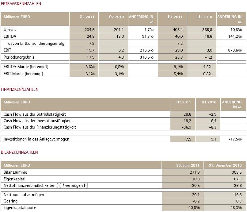 Im Geschäftsjahr 2006 stieg der Konzernumsatz aufgrund des organischen Wachstums auf 525,2 (i.V. 502,0) Mill. Euro. Das Ergebnis vor Zinsen und Steuern (EBIT) erreichte 30,3 (25,0) Mill. Euro. Vor Steuern verlieb ein Ergebnis von 27,3 (21,6) Mill. Euro, und nach Steuern von 9,0 (7,1) Mill. Euro stellte sich der Konzernjahresüberschuss auf 18,4 (14,4) Mill. Euro. Das Ergebnis je Aktie gibt die Gesellschaft mit 0,86 (0,75) Euro an. Für das Geschäftsjahr 2006 wurde die Dividendenzahlung an die Aktionäre wieder aufgenommen. Sie erhielten 0,25 Euro pro Aktie.